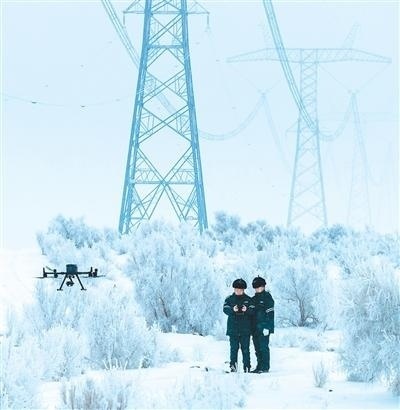 近日,新疆遭遇大范围寒潮天气。国网新疆电力公司组织工作人员对辖区线路开展特巡,保障极寒天气下电力稳定供应。图为新疆送变电有限公司员工利用无人机巡视线路。