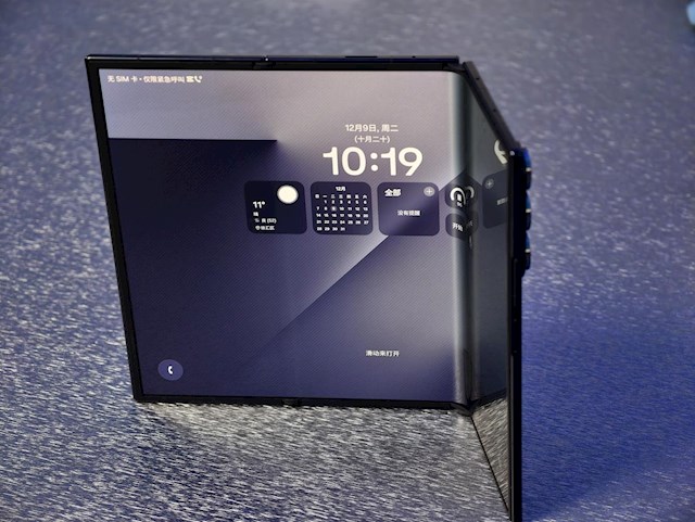 而且也因为这个双向内折的结构,它可以把两侧稍微折一点,立在桌面上形成一个半环绕的大屏,观影沉浸感很独特,属于三折独有的形态优势。